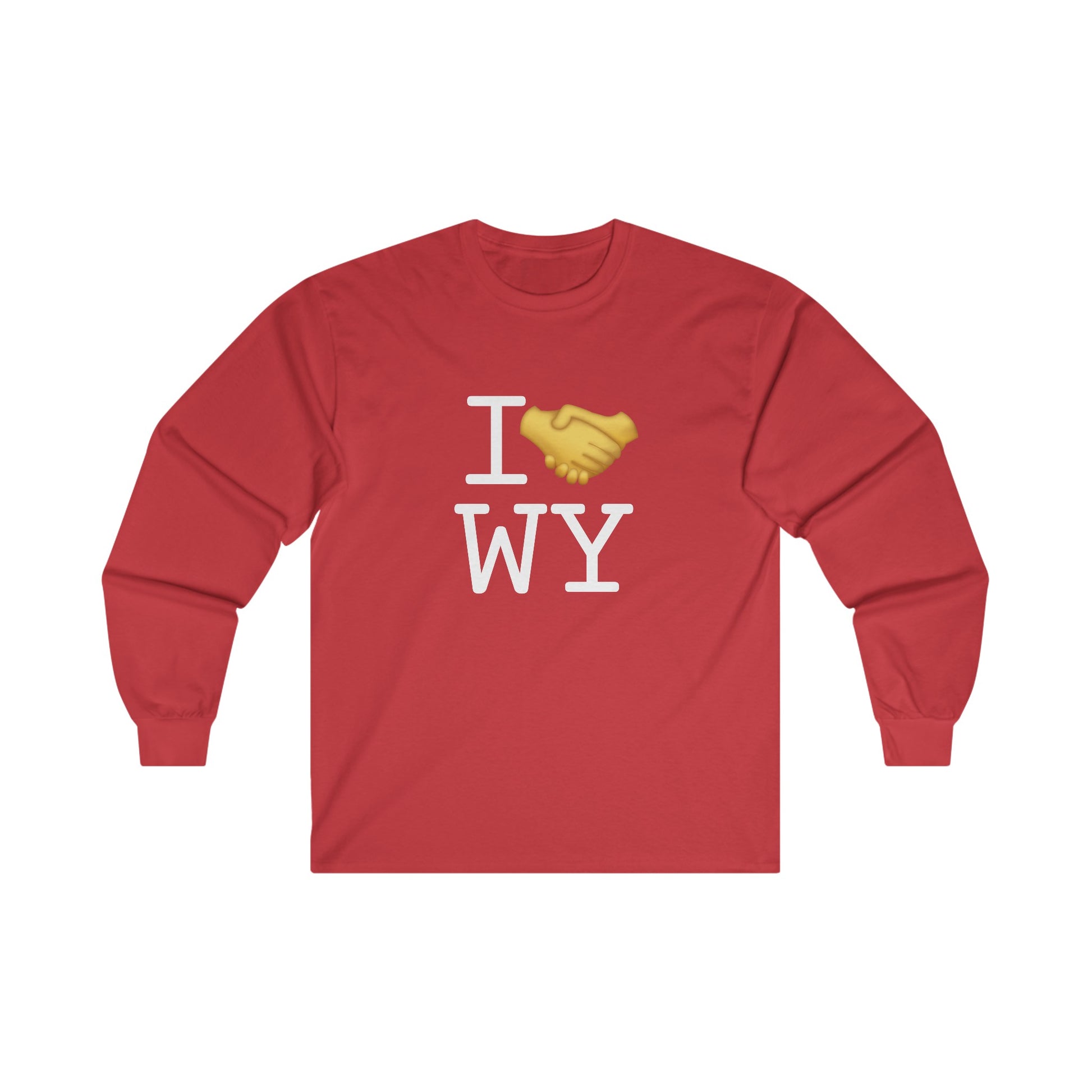 Welcome to the wide, wild world of Wyoming, where people are as rare as unicorns and the wildlife aren't just behind fences at the zoo. Big salutes to you, resolute nature lover, for embracing the state where wind is considered a legitimate form of wildlife. Saddle up in your finest flannel and get ready to throw on this "I 🤝 Wyoming" piece. Why a handshake? Well, whether you're fresh off the ranch or a cowboy at heart, Wyoming is the kinda place that's all about old school respect, no nonsense and a strong handshake that screams "I gotchu, bro," without uttering a single word.